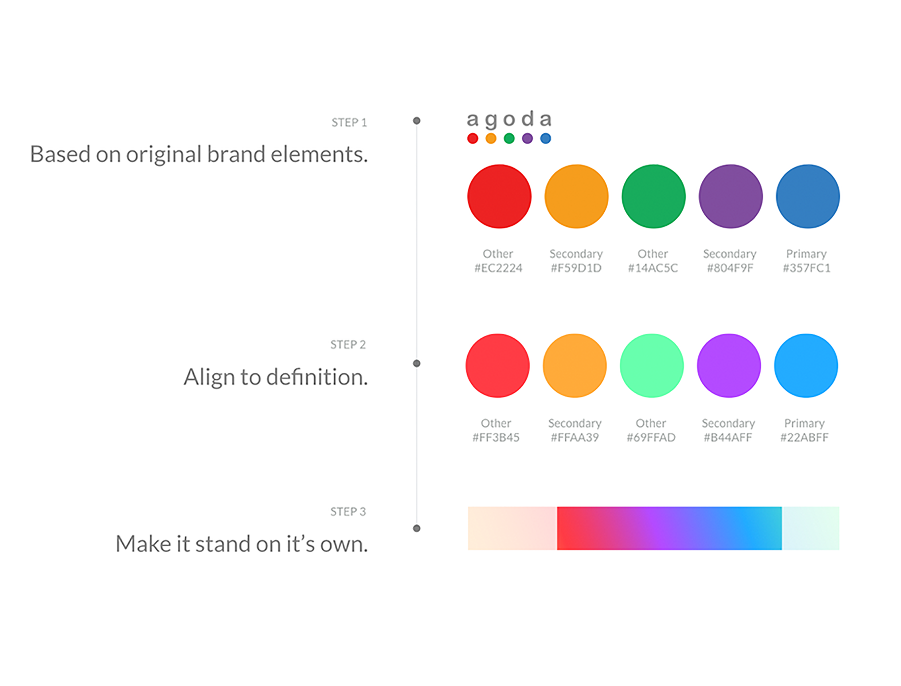 Lulu’s palette was established by augmenting the saturation of Agoda’s brand colors, and then extracting a gradient from the blended spectrum.